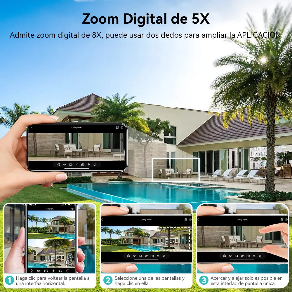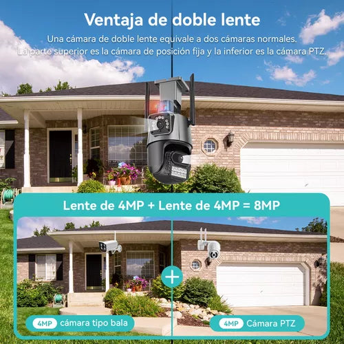 - Claridad Extrema (8MP) y Visión Dual: ¡No se te escapará nada! Su resolución te permite ver cada detalle con una nitidez asombrosa, con un sistema de doble lente para vistas panorámicas y acercamientos.